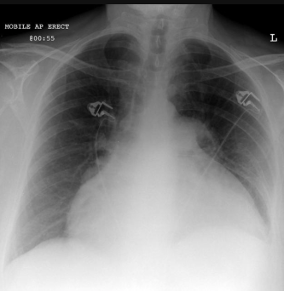 Enlargement of the cardiac silhouette may be due to cardiomegaly or pericardial effusion. When large, pericardial effusion may result in a 'water bottle heart' sign as shown below.