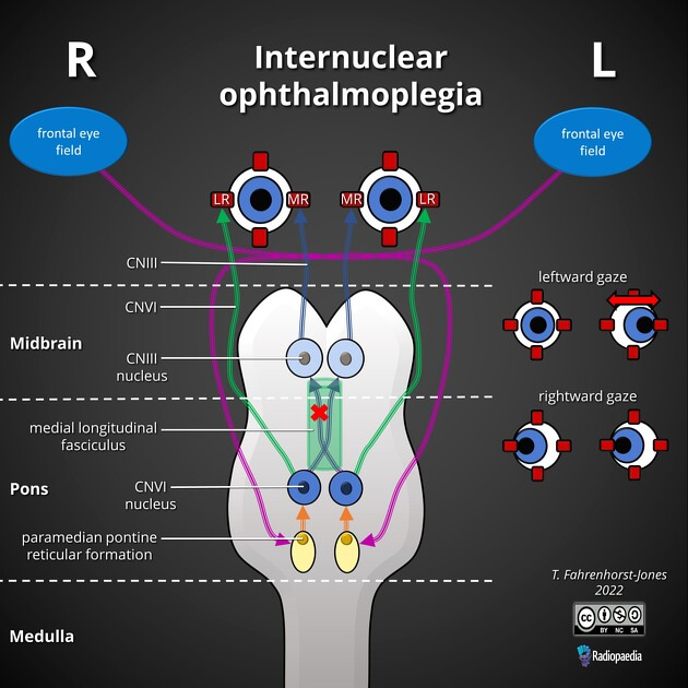 When there is something in the frontal eye fields, a signal is sent to the paramedian pontine reticular formation, located in the pons. The signal is generated by Brodmann area 8, which houses the frontal eye fields, it's role is to initiate and guide eye movements towards objects of interest in the visual field. Broadmanns areas are distinct areas in the cortex. This sends a signal to cranial nerve VI, the abducens, nucleus, located in the pons. From this nucelus, there is both a contralateral and ipsilateral tract. The ipsilateral tract controls the lateral rectus on the respective side, and the contralateral connects to the contralateral nucleus of cranial nerve III in the midbrain. The tract runs through the medial longitudinal fasciculus. This is a white matter tract found in the pons and is typically affected by MS. Once CNIII is activated, an efferent fibre is sent to the medical rectus, which then allows for leftward and rightward gaze (lateral rectus will pull, while medial rectus will almost 'push').
