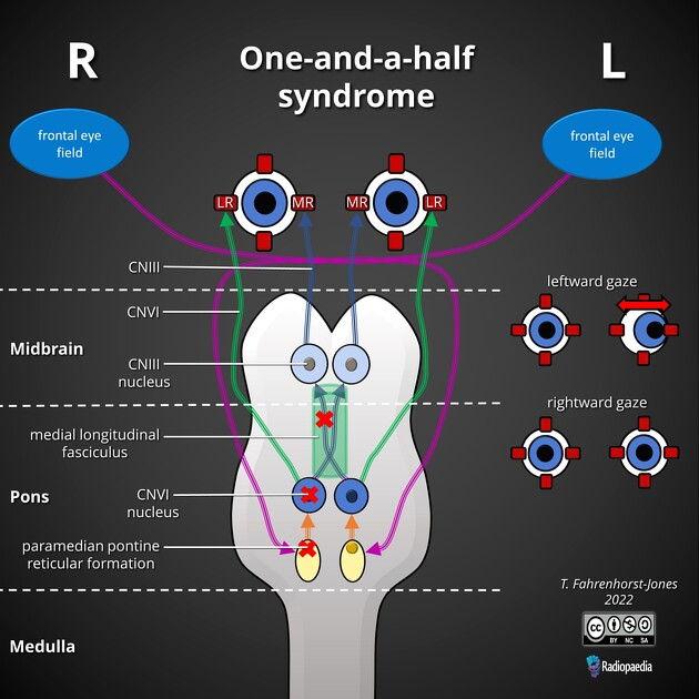 In one and a half syndrome, the MLF is affected, which causes an classic INO. Alongside this, there is a lesion either in the nucelus of cranial nerve VI or the paramedian pontine reticular formation. They tend to be on the same side (if the right MLF is affected, the right CNVI nucelus/PPRF will be affected).